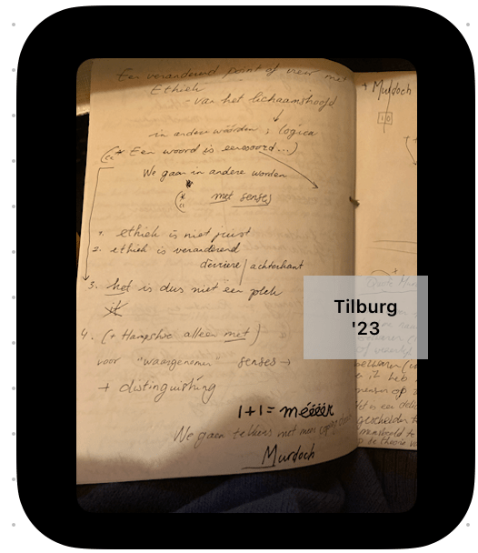 We gaan telkens met meer coping dealen. En Murdoch praat daarbij ook veel over dat in ons al gebrekkige waarnemen en het te kunnen vertalen ook delen verloren gaan. Het gaat er haar niet om dat ‘het moment’ voorbij is, maar ik denk dat ze bedoeld dat er meer is tussen hemel en aarde. Wat wij doen in ons uiterlijke leven is voor haar erg belangrijk. Het onderscheid, distinguisihing wat ik hierboven heb geschreven is een ongoing proces van een ethiek van beleving waarbij bij mij de woorden klinken: voltuurigheid (altijd) en voortdurend-heid (for the time being) en bij het distinguishing – veronderstelling van het gebeurende wat nooit compleet is. Heb ik iets gehoord van een ander? –> dan vorm ik mijn eigen mening. Het vreemde is, dat wat binnenkomt ‘dit is een door mij geziene boom’ wat kan duiden op een manische of psychotische beleving of in een ‘high’ aan kan voelen als vreemd. Hier is sprake van distinguishing en vallen grenzen weg. Er is geen echte reden om hier van te schrikken. Als je vind dat angst, of jou angst overwegend in een ‘high’ moment zit, is het denk ik geen ‘high’ moment. Dat is veel meer raar en onbekend. Als je op zo’n moment angst voelt in je lichaam. Dat kan heel goed. Het is wèl belangrijk wat we in ons uiterlijke leven doen en daarom moeten we ook dingen blijven doen en onze lichamen blijven gebruiken op manieren waar we van kunnen leren.